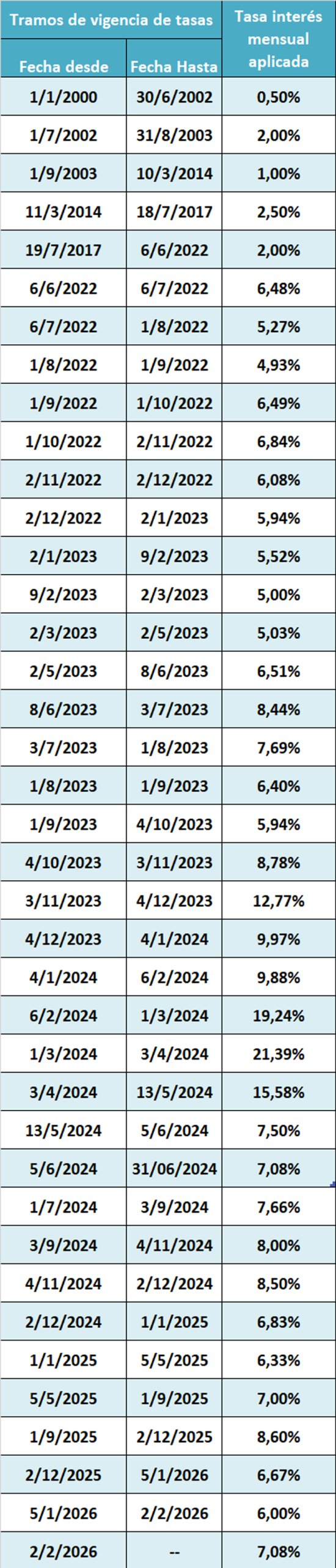 Tasa de Interés por mora mensual histórica y vigente